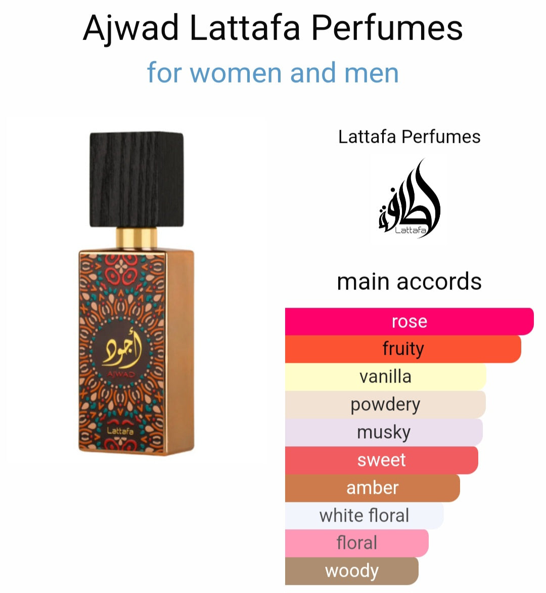 Lattafa Ajwad Edp a natural spray sweet perfume full of aromas of amber, rose and sandalwood. It is slightly sweet vanilla scent, nicely caramelized, with a lot of fruit and cedar wood blended. Using this smell gets into your mind away, where the Amira tells her stories and where dreams become reality. Relax your mind and let yourself be charmed by this oriental fragrance cocktail. It is packed in a beautiful elegant bottle and a beautiful outer box.