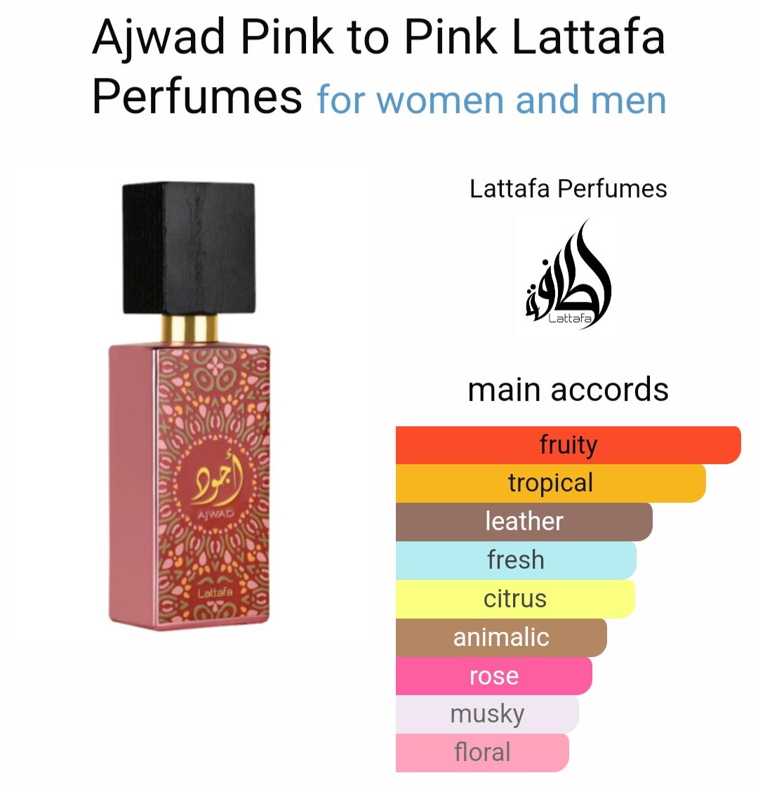 Ajwad Pink to Pink by Lattafa Perfumes is a captivating new fragrance for women, launched in 2024. This enchanting scent opens with a lively and refreshing blend of guava, pink grapefruit, lychee, and pink pepper, creating a vibrant and succulent introduction. As the fragrance develops, the heart notes unveil a beautiful floral bouquet, featuring the timeless elegance of rose, the delicate charm of peony, and the graceful allure of magnolia. In the base, rich and warm notes of leather, musk, ambergris, vanilla, and moss come together, providing a sensual and enduring finish. Ajwad Pink to Pink is a harmonious composition that leaves a lasting impression of sophistication and allure.