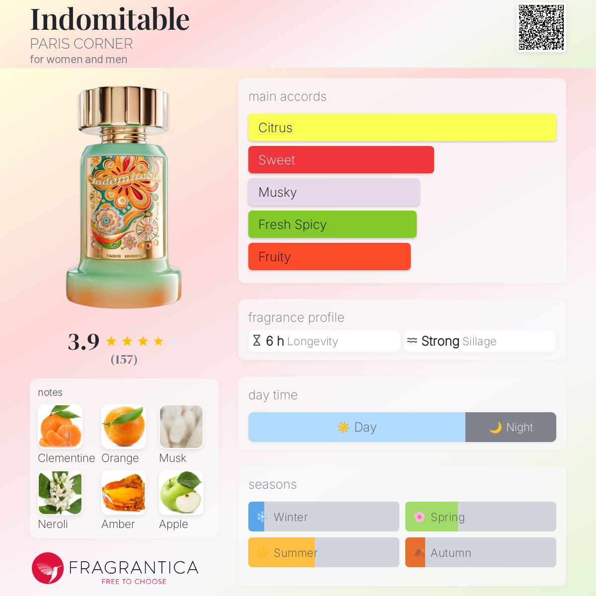 Indomitable by PARIS CORNER is a Citrus Aromatic fragrance for women and men. This is a new fragrance. Indomitable was launched in 2025. Top notes are Clementine and Orange; middle notes are Apple, Black Pepper and Woody Notes; base notes are White Musk, Neroli and Amber.