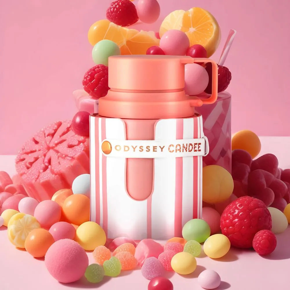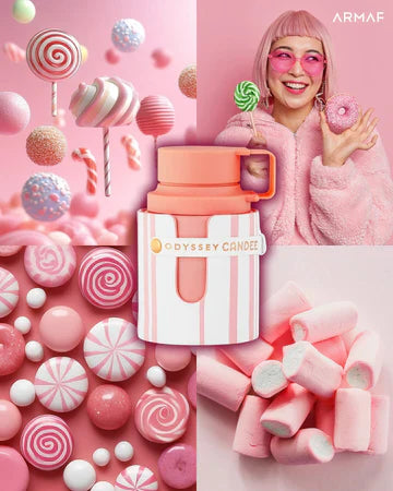 Odyssey Candee by Armaf is a fragrance for women. This is a new fragrance. Odyssey Candee was launched in 2024. Top notes are Strawberry, Raspberry, Geranium, Peach and Bergamot; middle notes are Caramel, Jasmine and Passionfruit; base notes are Patchouli, Musk and Amber.